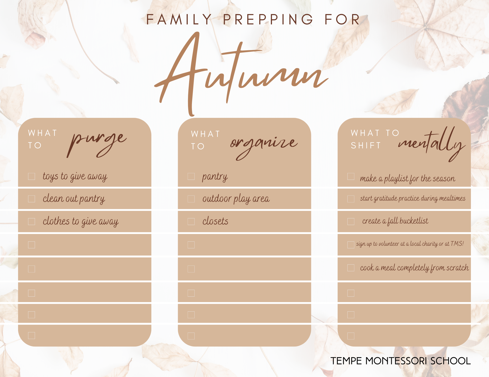 Let’s set ourselves, our families, and our children up to enjoy all the goodness autumn brings. After the long summer months, we often need to intentionally hit the reset button - for our minds, our hearts, and our homes. Fall break provides the perfect opportunity to properly welcome the new season before it creeps in quietly and quickly, allowing the year to end in a blur. Autumn is time for purging and big exhales; a type of Fall “reset”, if you will. We can begin with our minds then our physical spaces. Let’s relish in the reward of ridding these places of unhealthy or unnecessary clutter and make room for something more worthy to take place. Involve your kids in decluttering or changing out spaces in their rooms or common rooms in the home. Let them take a look at what they can shed in order to make room for any growth this season may hold for them. Once we all breathe a little lighter, we welcome fresh perspective in this new season. Involve your children in making lists of things they want to feel or see and understand with renewed clarity.