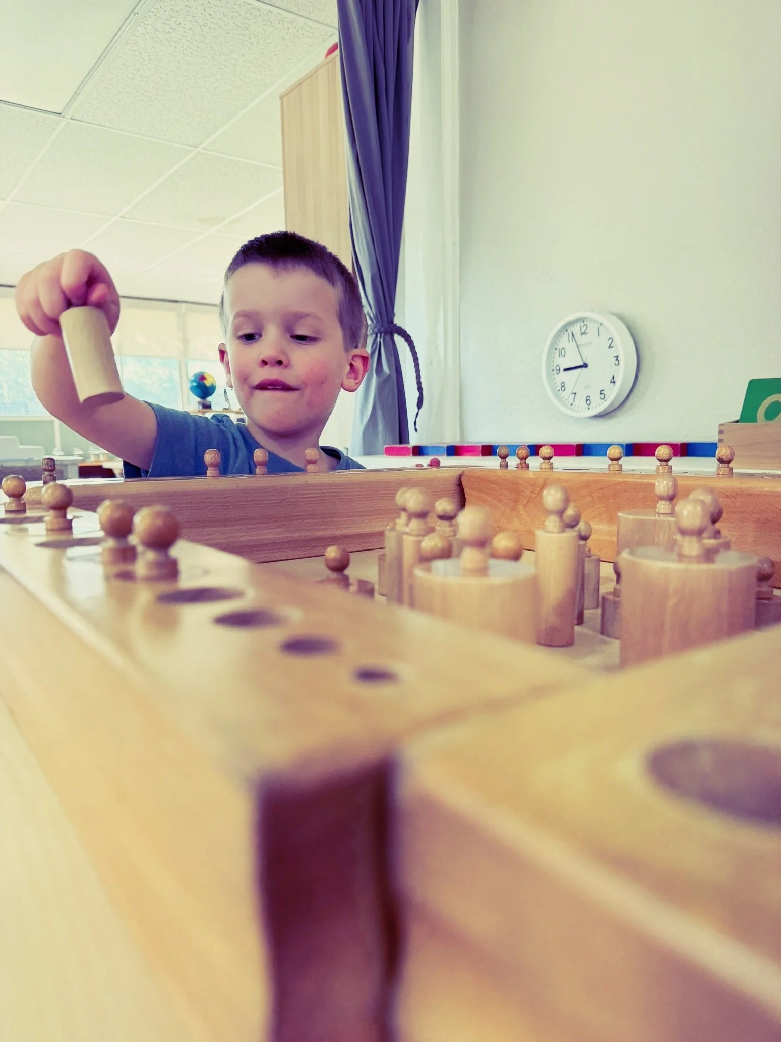 Montessori classrooms were originally named “Children’s Houses” because they were designed to be places where the perspective of the child was paramount. Continuing in this tradition, our classrooms, filled with developmentally appropriate activities, carefully chosen and beautifully prepared, and equipped with child sized furniture, communicate to the children that this is a special place for them. When Dr. Montessori first designed her teaching materials, the concept of self-correction was very important to her. This self-correcting feature enables each child to develop independence, as well as fosters the child’s ability to progress at the pace that is unique and perfect for our students.